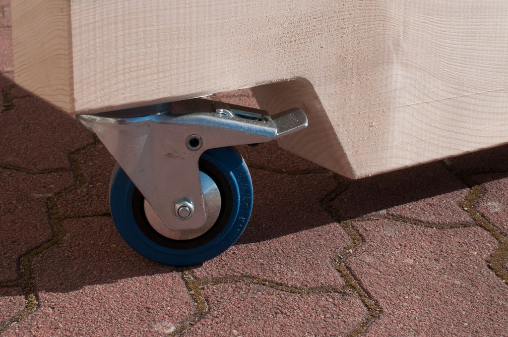 4 roulettes charge lourde pivotante, Ø 100, avec frein et bande de roulement anti-trace.
